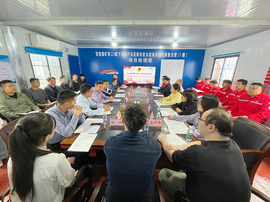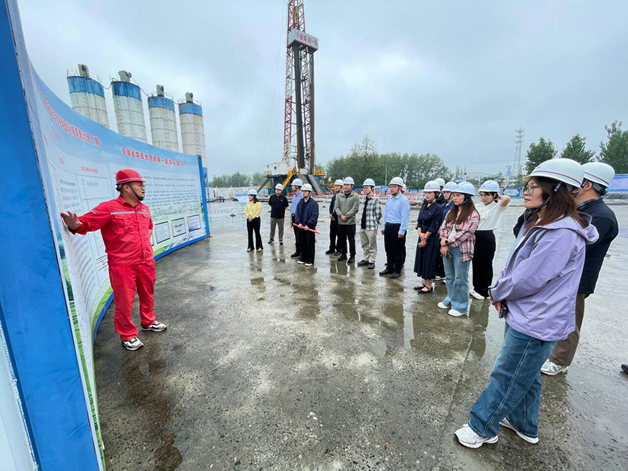 在项目现场,项目部经理胡龙为大家详细介绍了张集水害地面区域探查治理项目的具体情况。全体人员共同参观了钻机井场,近距离观察设备运行;走进办公区与职工生活区,了解一线人员的日常工作与生活环境;登上钻机施工平台,与施工人员面对面交流,深入了解钻机施工流程、技术要点及安全保障措施。