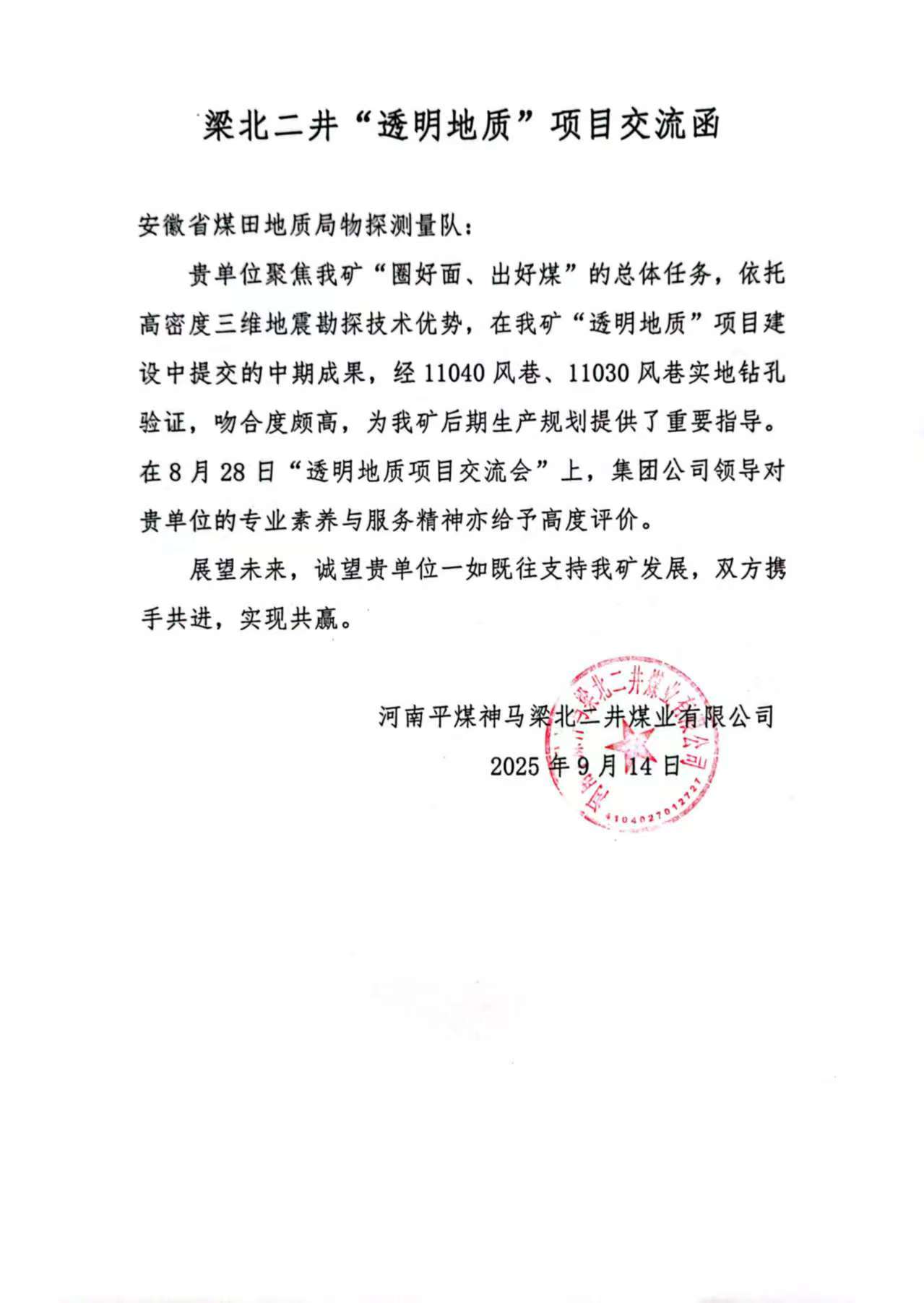 图为物测队收到的中国平煤集团“透明地质”项目交流函