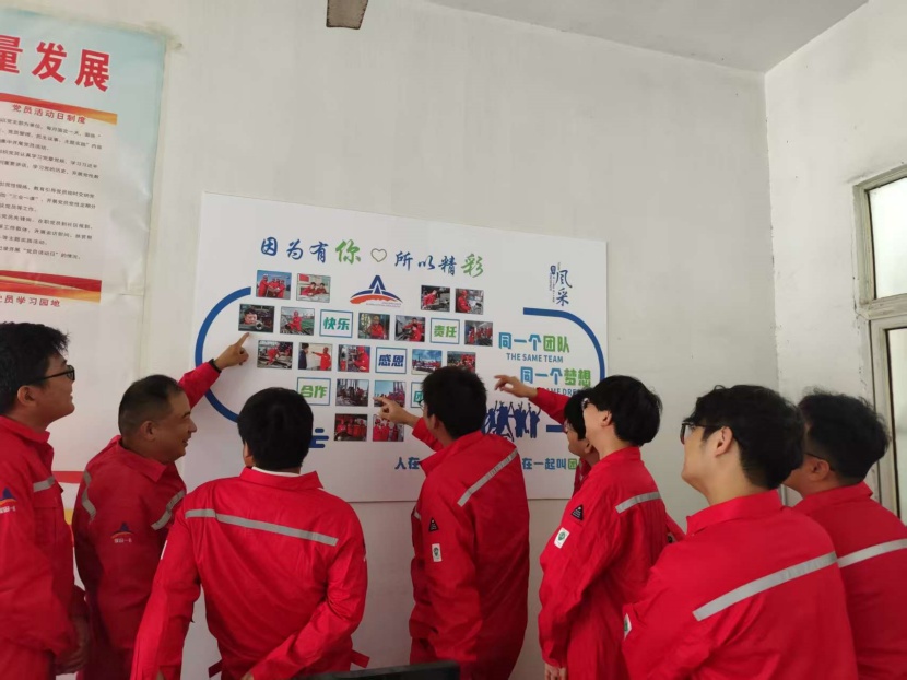 图为一线职工在项目部欣赏比赛作品“照片墙”