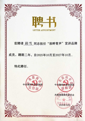 邱雪同志在受聘后表示:“手持这份沉甸甸的聘书,成为‘淮畔青声’的一员,我倍感光荣,也深知责任在肩。这不仅是一份荣誉,更是一份承诺。我将继续扎根地质一线,用脚步丈量山河,也用声音讲述我们地质人的奋斗故事,让青春在讲述与传承中绽放更加绚丽的光彩。”