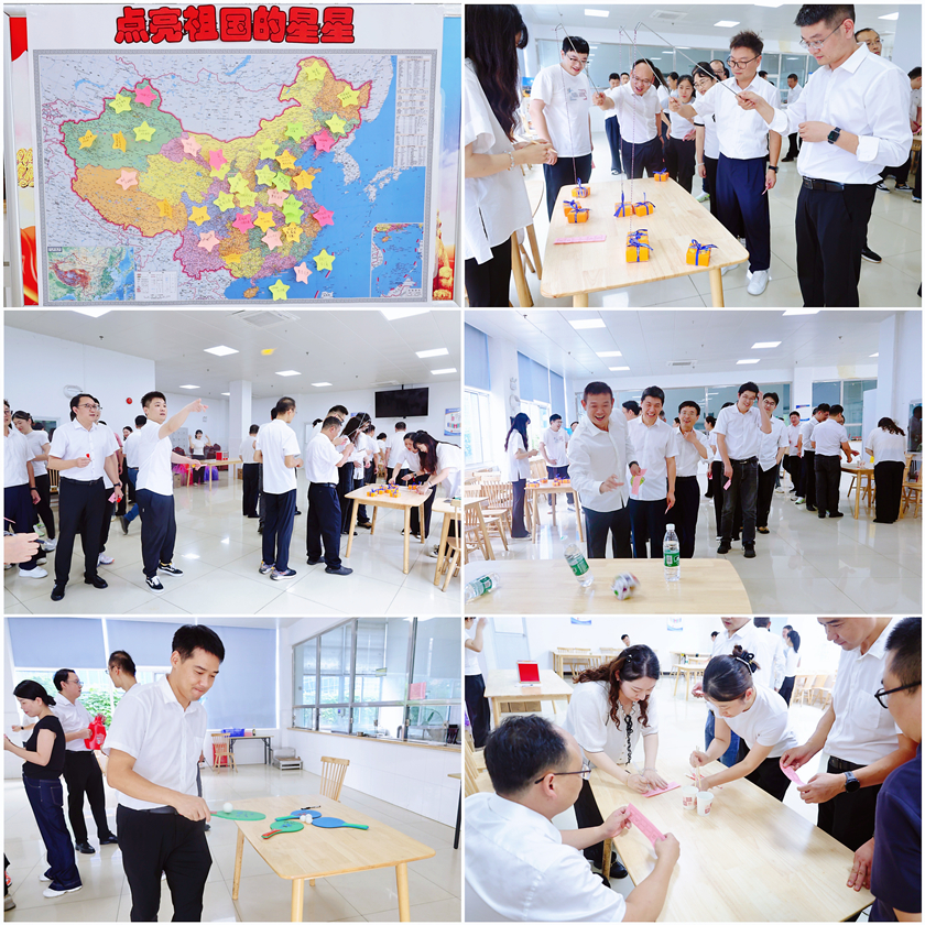 本次活动创新采用闯关模式,精心设计了六个富有双节特色的趣味项目。在“点亮祖国的星星”开场环节,员工们在星星形状的贴纸上写下对祖国的美好祝愿,汇聚成一片璀璨的祝福墙,展现了员工们的家国情怀。“带着月亮去旅行”环节,参与者们手持乒乓球拍,小心翼翼地托举着象征圆月的乒乓球前行,现场气氛紧张而有趣。“射月亮”飞镖项目考验的是参与者的精准度,每一次命中都引来阵阵掌声;“钓月饼”环节妙趣横生,参与者们手持钓竿,专注地钓起象征团圆的月饼;“海底捞月”需要用筷子从水中夹起光滑的彩珠,既考验手眼协调,又充满挑战乐趣;最后一关“愤怒的玉兔”将现场气氛推向最高潮,大家化身“神投手”,沙包划出优美弧线直击目标。“砰!”随着矿泉水瓶应声倒下,阵阵喝彩与欢呼瞬间引爆全场,将运动会变成了欢乐的海洋。
