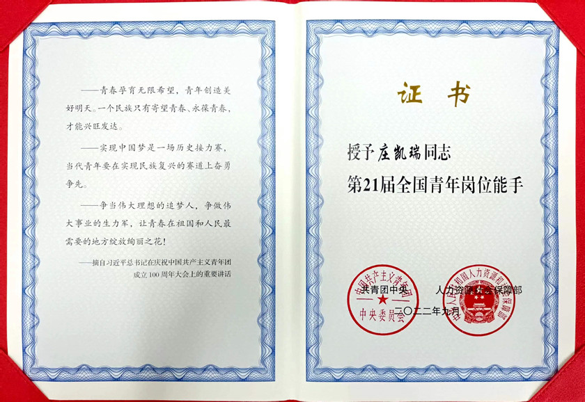 学院庄凯瑞同学荣获第21届全国青年岗位能手称号