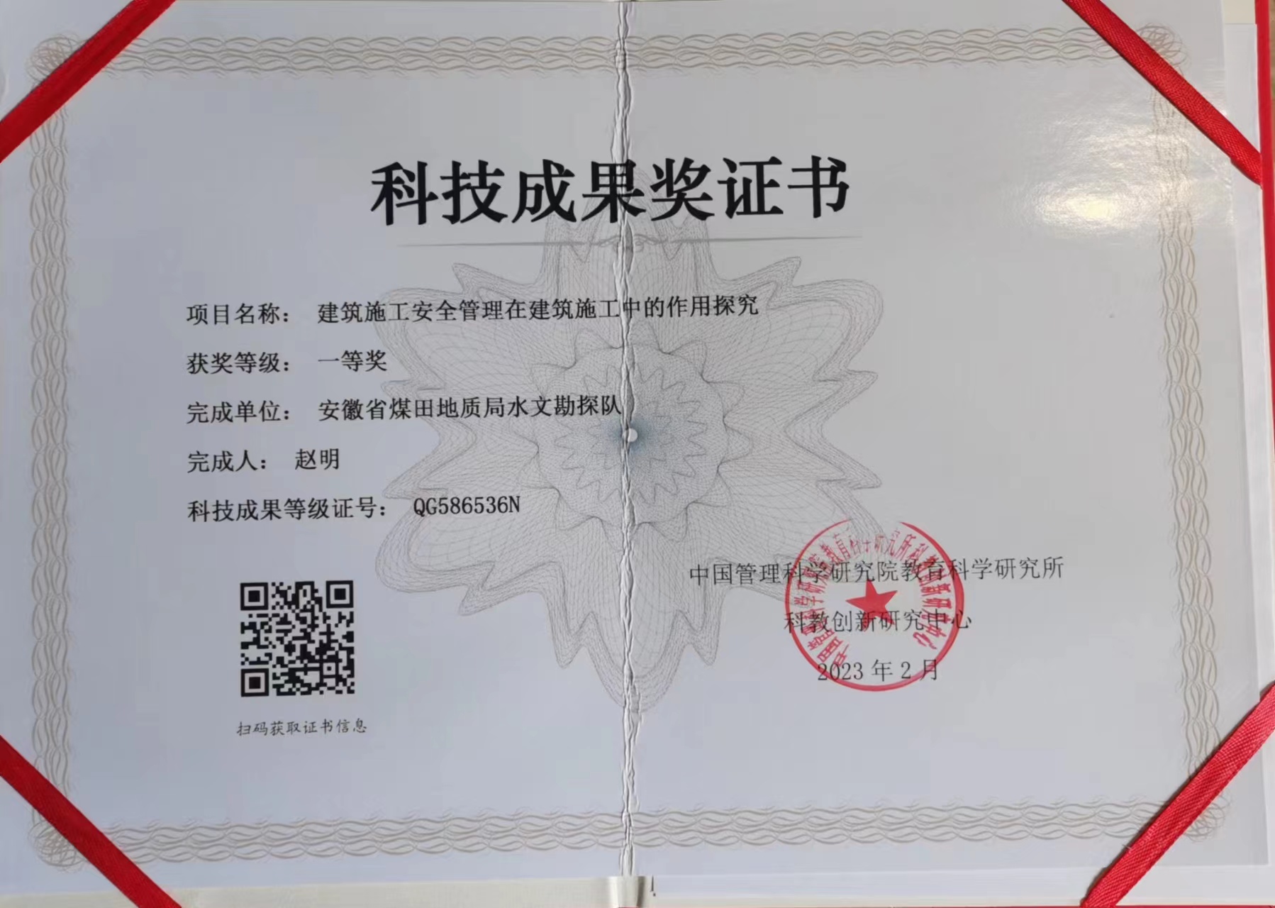 日前,水文队职工赵明撰写的论文《建筑施工安全管理在建筑施工中的作用探究》,在中国管理科学研究院教育科学研究所科教创新研究中心组织开展的市政建筑领域科技成果评选中荣获一等奖。
