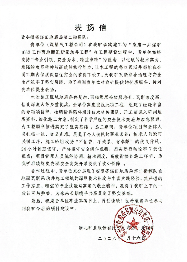 近日,二队收到淮北矿业股份有限公司袁店一井煤矿发来的表扬信,信中对二队在“1052工作面地面瓦斯采动井工程”中展现的专业能力、攻坚精神和高效履约给予高度肯定。这封表扬信不仅是一份荣誉,更是二队长久以来深耕皖北市场、以实干赢得信赖的有力见证。2025年,二队在该区域同步推进5项瓦斯治理工程,最高同时开动钻机 9 台套,合同总额创历史新高,累计完成钻探进尺超过1.2万米,创造了仅用10天完成“三通一平”、36天高效完成钻井的施工记录,以优异的工程实绩彰显了在瓦斯综合治理领域的技术实力与品牌价值。