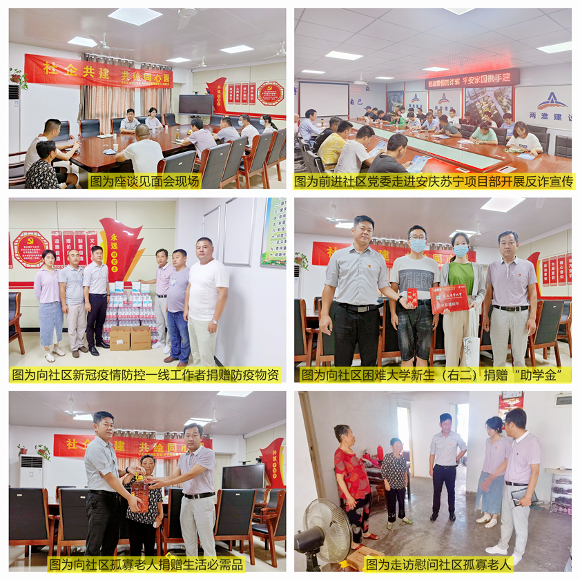 本次活动由两大环节组成,一是前进社区党委走进两淮安庆苏宁项目部,以“提高警惕防诈骗 平安家园携手建”为主题,进行反诈骗知识宣传,以案示警,为项目建设护航,增强项目员工反诈意识;二是两淮建设建筑分公司党支部走进前进社区,召开座谈见面会,走访慰问孤寡老人、困难大学新生和新冠疫情防控一线工作人员。