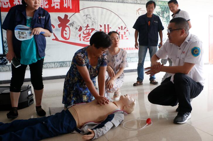 图为管理处职工在李龙祥部长的指导下进行心肺复苏抢救演练