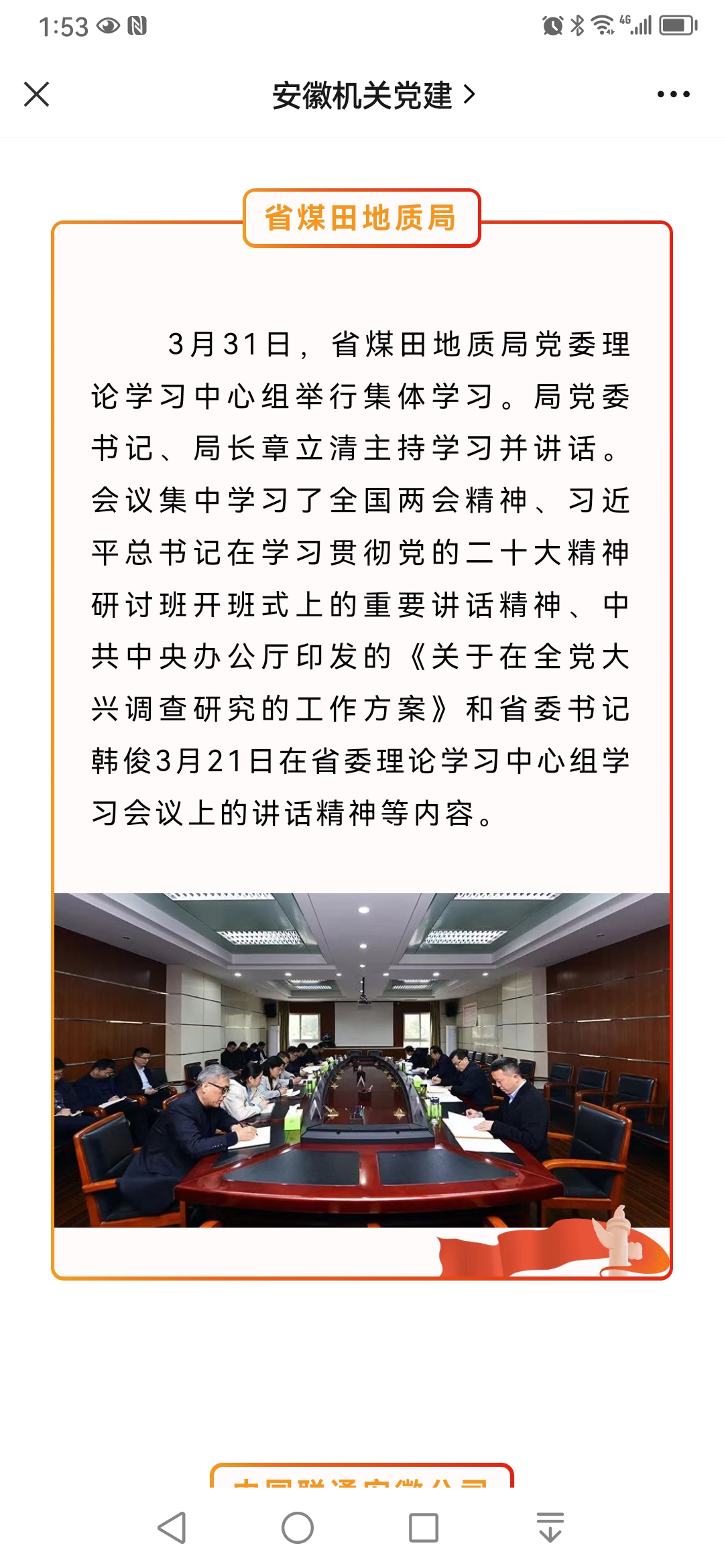 省煤田地质局党委中心组学习全国两会精神——见2023年4月5日安徽机关党建微信公众号