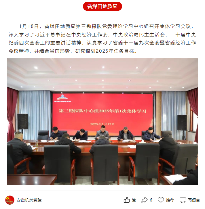 省煤田地质局第三勘探队党委理论学习中心组召开集体学习会议——见2025年1月24日安徽机关党建微信公众号