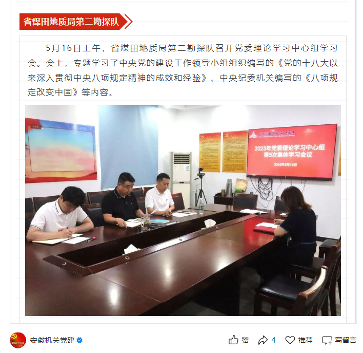 省煤田地质局第二勘探队召开党委理论学习中心组学习会——见2025年5月21日安徽机关党建微信公众号